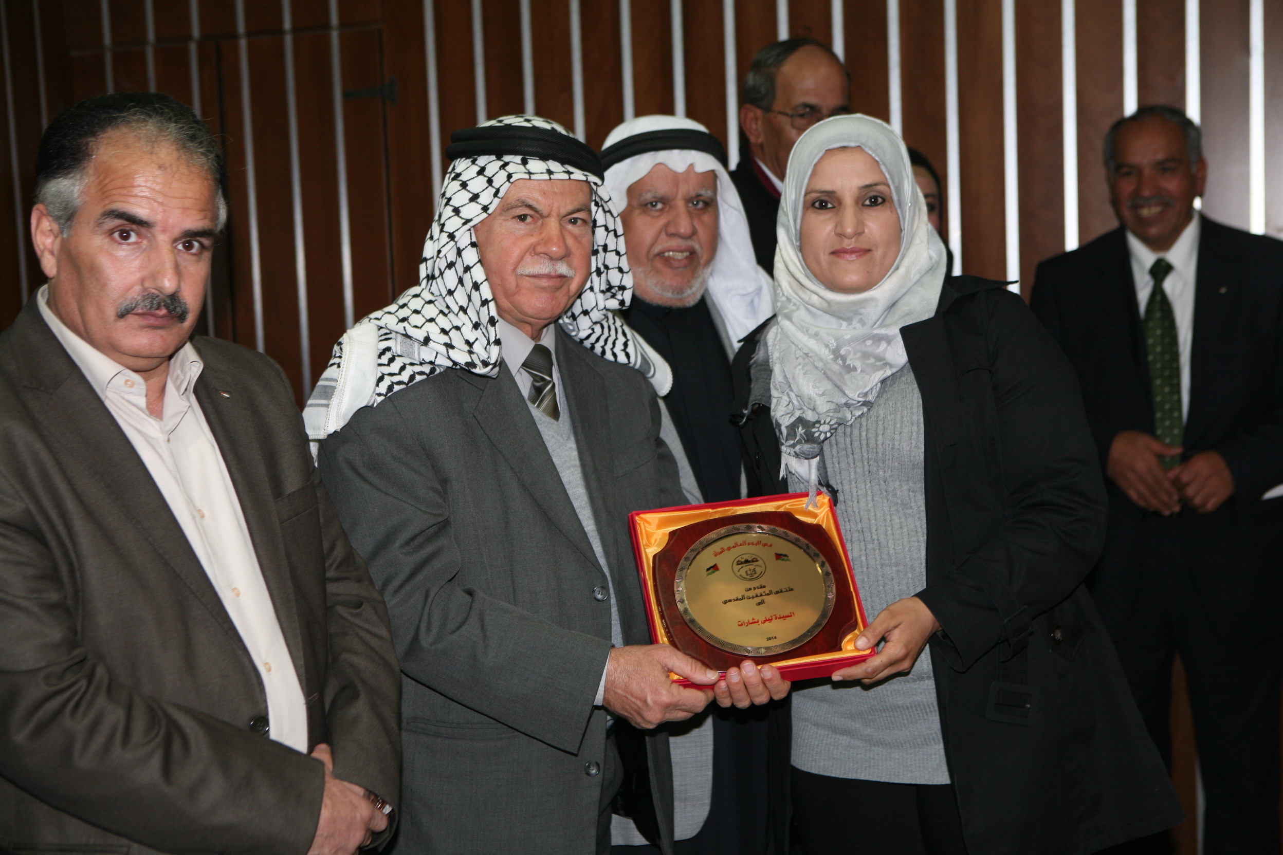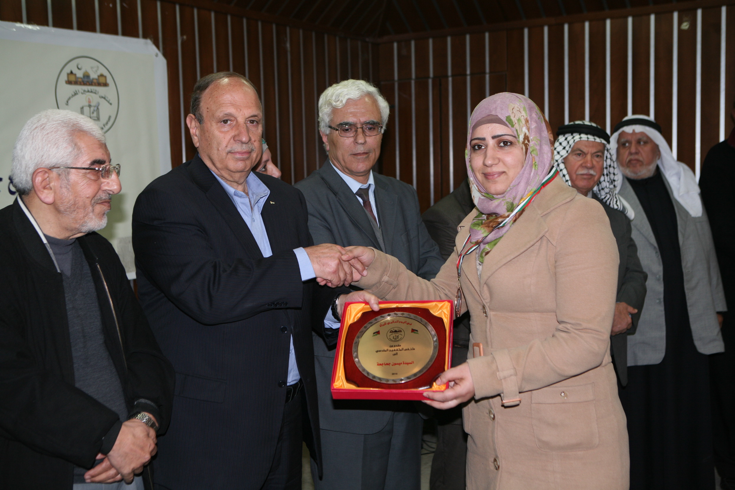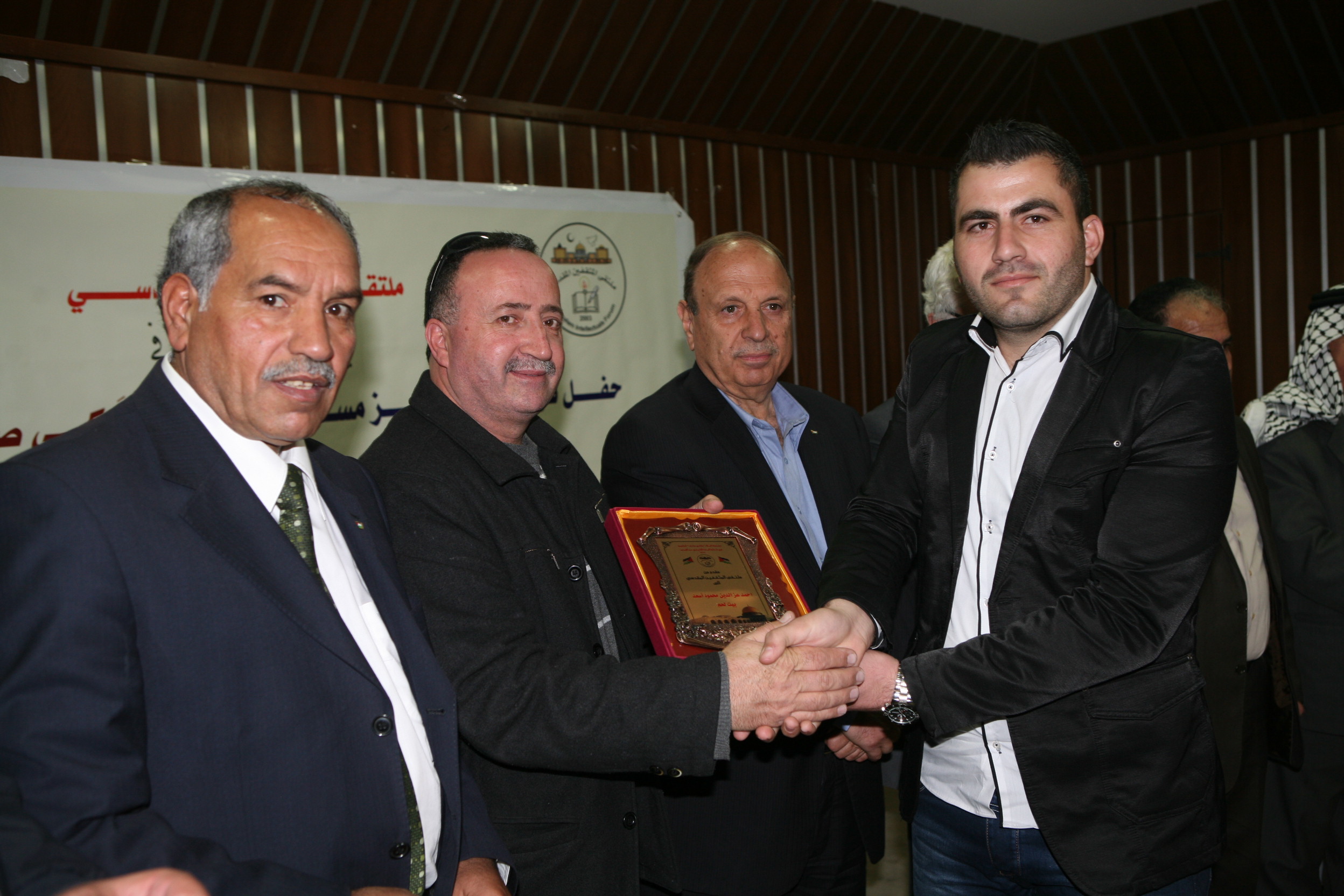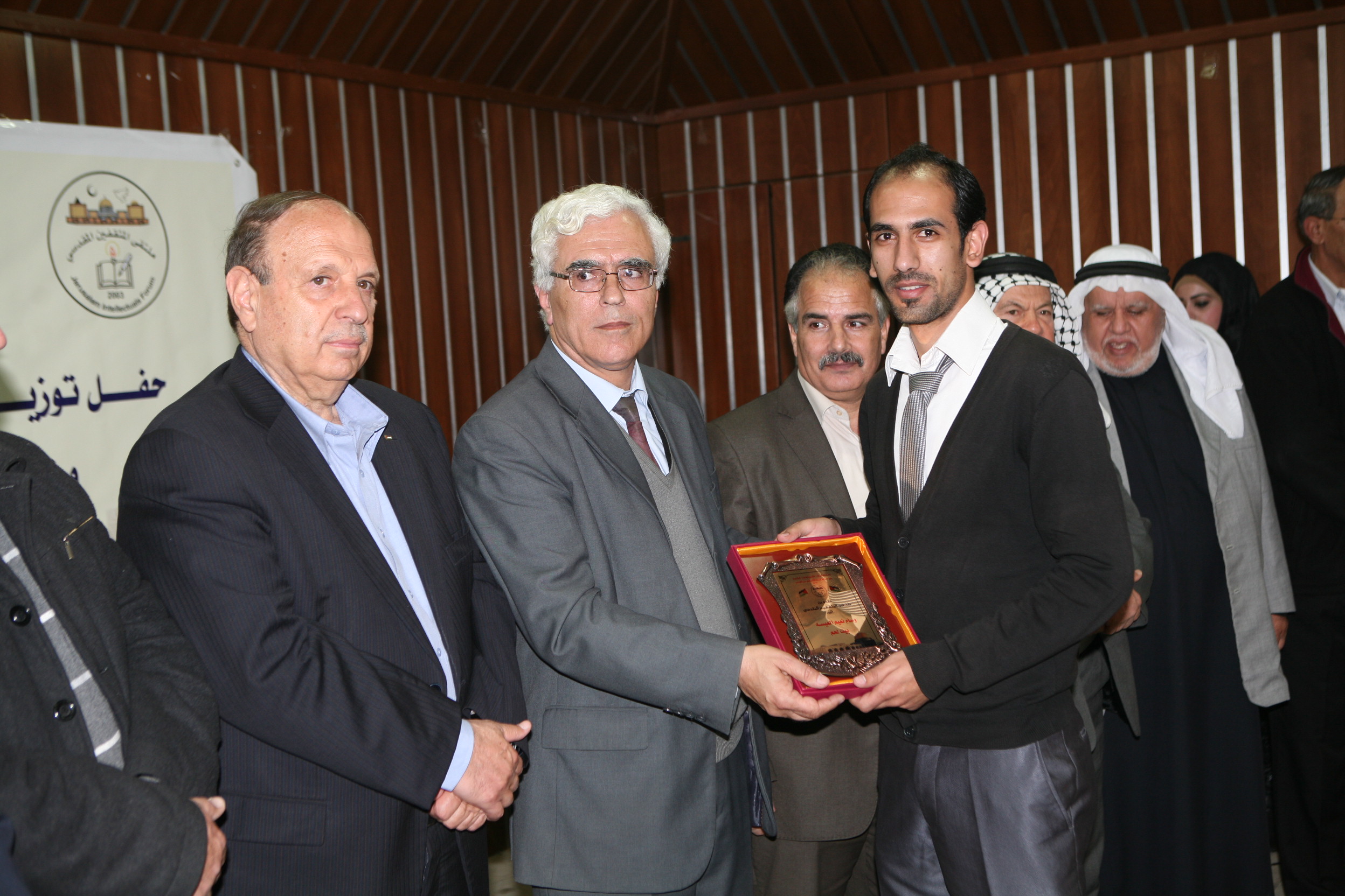 وفي نهاية الحفل قامت لجنة التكريم برئاسة الدكتور طلال ابو عفيفة رئيس ملتقى المثقفين المقدسي و المحافظ عدنان الحسيني و الشيخ عباس نمر و محمد عبد ربه مدير عام أمن المؤسسات و كل من الشيخ محمد مسك و الاستاذ محسن عابدة و الاستاذ طارق الشرطي اعضاء الملتقى بتكريم الفائزون بمسابقة ملكي صادق وهم : الاء راتب – القدس، عبير حلمي -القدس، ايمان عواد – القدس، نادية مسعف – بيرزيت، عدي محمد – نابلس، احمد اسعد – بيت لحم، وسام العيسة – بيت لحم و منى احميدات – الخليل.